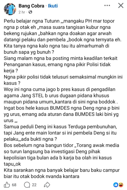 “PERLU BELAJAR NGANA TUTUN MANGAKU PH MAR TOPOR NGANA P OTAK EH… KITA SARANKAN NGANA BANYAK BELAJAR, BARU BAKU CAMPUR BIAR ITU OTAK BODOK NYANDA KANTARA.”