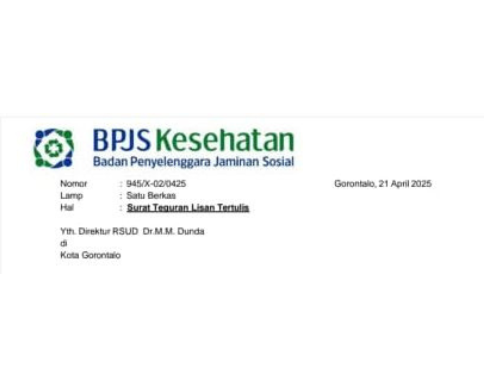 Dalam surat ini, pihak BPJS Kesehatan Gorontalo menyampaikan beberapa hal kepada pihak RSUD MM Dunda Limboto, apabila tidak segera melakukan perbaikan pelayanannya.