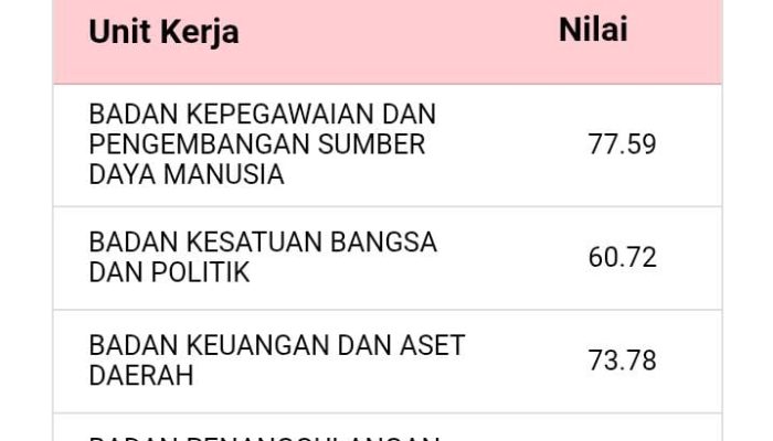 Sementara itu, Badan Kesatuan Bangsa dan Politik mencatat skor terendah dengan 60,72, diikuti oleh Dinas Komunikasi dan Informatika (63,55) serta Dinas Perhubungan (63,95).