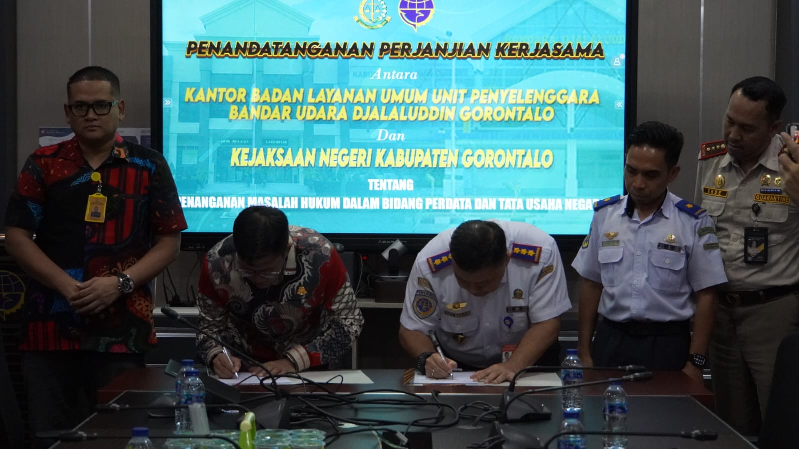 POTRETNEWS.ID, Gorontalo – Dalam rangka memperkuat aspek hukum penyelenggaraan layanan di bandara Djalaluddin. Kejaksaan Negeri (Kejari) Kabupaten Gorontalo resmi menandatangani perjanjian kerja sama dengan Kantor Badan Layanan Umum (BLU) Unit Penyelenggara Bandar Udara (UPBU) Djalaluddin Gorontalo, Sabtu (22/3/2025).