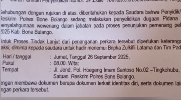 Surat panggilan yang beredar luas di masyarakat menyebutkan bahwa RH diminta hadir di Polres Bone Bolango pada Jumat, 26 September 2025. Ia akan dimintai keterangan oleh penyidik Satreskrim terkait dugaan penyalahgunaan wewenang dalam proses penunjukan pemenang proyek Lapkesda.